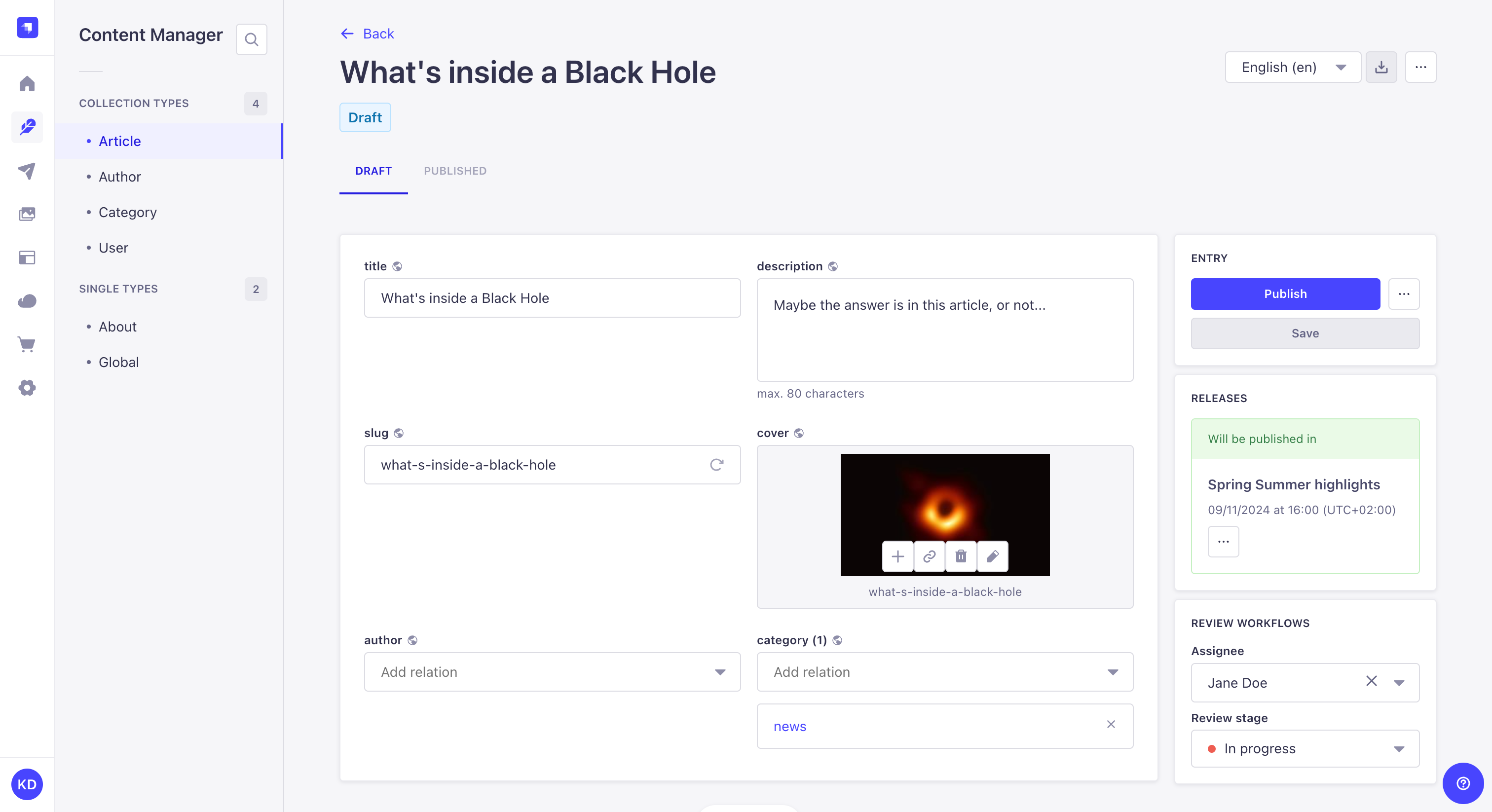Strapi allows you to manage your content throughout its whole lifecycle, whether you are working on its draft version, about to finish it and share it with the world, or wanting to delete it when it's obsolete.